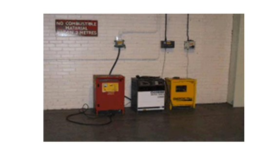 – Locate battery charging in a designated area of a building kept clear of combustible material. Provide a clearance of at least 2m (6.6 ft) between the charging operation (unit and vehicle) and any adjacent combustible materials including combustible building construction.